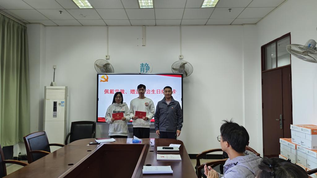 为新党员佩戴党徽并赠送政治生日纪念卡。