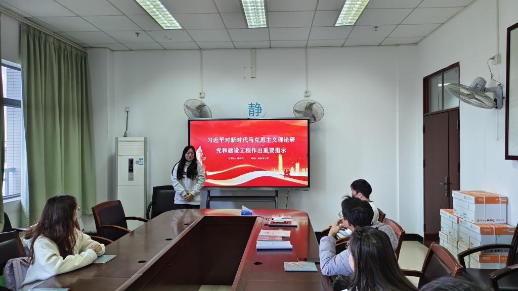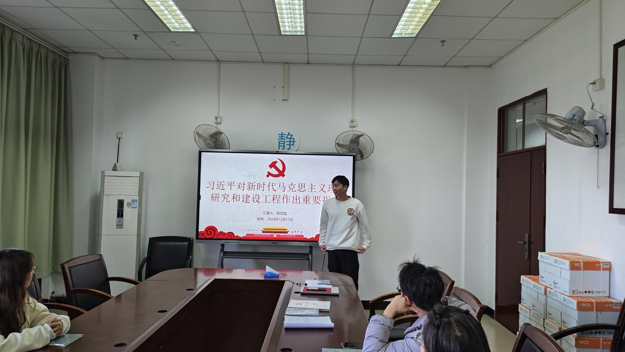 会上,全体党员共同学习习近平对新时代马克思主义理论研究和建设工程作出重要指示强调——扎根中国大地赓续中华文脉厚植学术根基,为推进马克思主义中国化时代化作出更大贡献。学生党员林桂竹、郑文旭作为党员代表分享学习心得。
