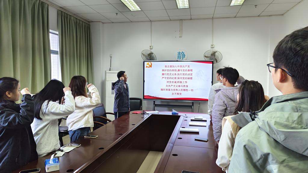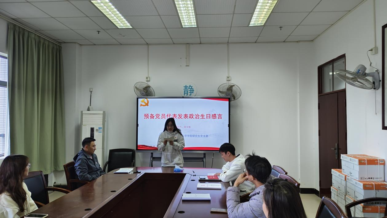 接着进行新党员入党宣誓暨“政治生日”活动。全体党员重温入党誓词,由研究生党支部书记张洪杨领誓。