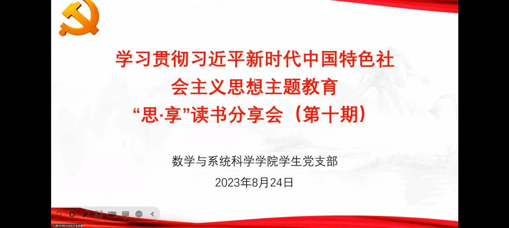 为加强学生党支部学习氛围建设,倡导终身学习理念,营造爱读书、读好书、善读书的浓厚氛围。数学与系统科学学院学生党支部8月24日晚上于腾讯会议线上开展了学习贯彻习近平新时代中国特色社会主义思想主题教育“思•享”读书分享会(第十期)。学生党支部书记王婷婷及全体党员参加了本次分享会。