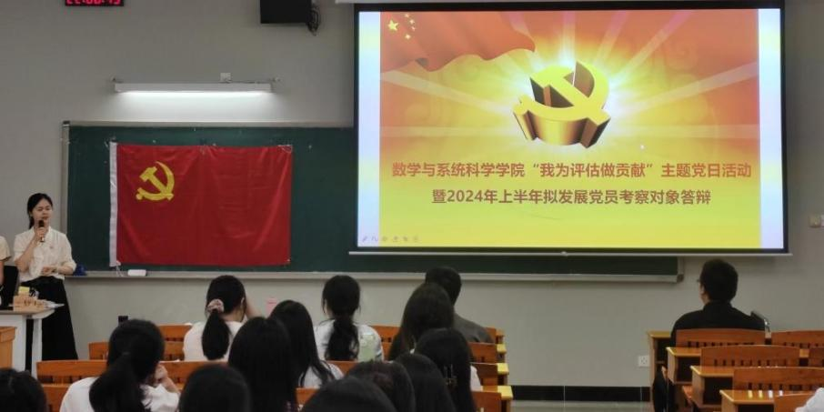数学与系统科学学院本科生党支部于2024年4月24日下午17:00在三教307召开“我为评估做贡献”主题党日活动暨2024年上半年拟发展党员考察对象答辩会议,本科生党支部书记王婷婷、辅导员曾祥龙、刘敏、陈薇羽以及全体学生党员参加了本次会议。会议由支部书记王婷婷主持。