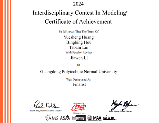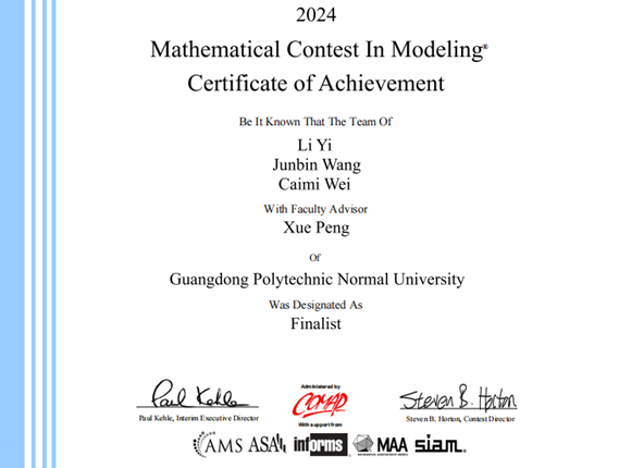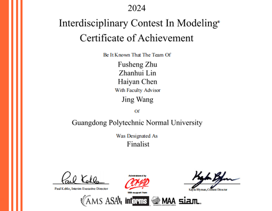 近日,2024年美国大学生数学建模竞赛与交叉学科数学建模竞赛(MCM&ICM)成绩揭晓。我校学子拼搏努力,再创佳绩,夺得国际特等奖提名(Finalist)3项,国际一等奖(Meritorious Winner)2项,国际二等奖(Honorable Mention)9项。其中,我院彭雪老师指导的队伍获得特等奖提名1项、国际一等奖1项,另1项国际一等奖则由我院蒋经华老师指导的队伍获得。此外,我院陈月红、陆尧、孙中举、张冰等教师指导的学生也获得了国际二等奖。我院2020级信息与计算科学专业的侯冰冰等17名同学获得了上述奖项。