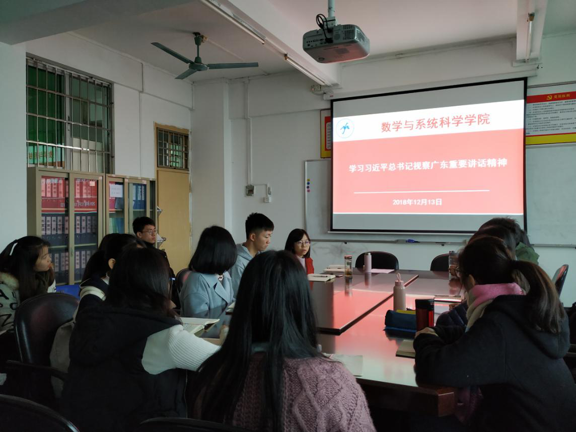 12月13日下午15:00,在校本部第一教学楼1211会议室,数学与系统科学学院召开2018年下半年发展对象通表会议。会议由学生党支部书记李秋主持,辅导员王婷婷列席。会后组织全体党员及发展对象深入学习了习近平总书记视察广东讲话精神。