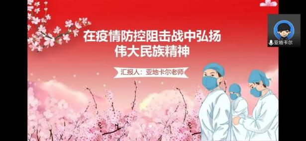为切实加强学生心理健康教育,增强对集体的认同感、归属感,我院于2020年4月2日开展了“共抗疫情,爱国力行”的心理辅导特色主题团课活动。在本次活动中,学院辅导员亚地卡尔老师与同学们分享交流在疫情期间的思考。通过此次活动,有效地缓解了同学们疫情居家而产生的孤独感和焦虑感。