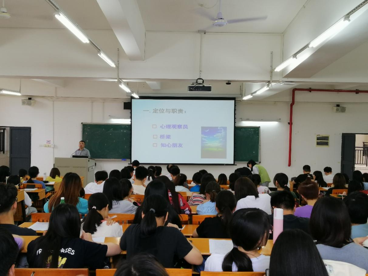 首先,由学生处心理咨询中心任增辉老师对各班心理委员与宿舍信息员进行培训。第一,明确宿舍信息员的定位与职责,要求舍长化身心理观察员与知心朋友与舍友之间搭建友谊桥梁,从而了解和判断宿舍各成员的心理健康情况。第二,丰富了心理委员和宿舍观察员心理方面的知识,讲解了如何通过“怪、荡、困、扰”快速识别心理异常情况。第三,要求心理委员与宿舍舍长要有危机干预的意识,若发现危机事件迹象,要及时报告辅导员。