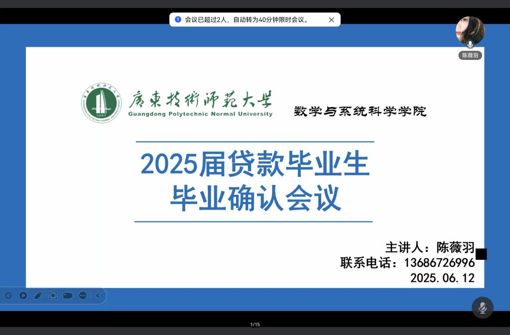切实推进贷款毕业生的毕业确认工作,做好相关贷款政策的普及和宣传,2025年6月12日,我院召开了线上贷款毕业生毕业确认暨诚信教育工作会,辅导员陈薇羽组织并主持。